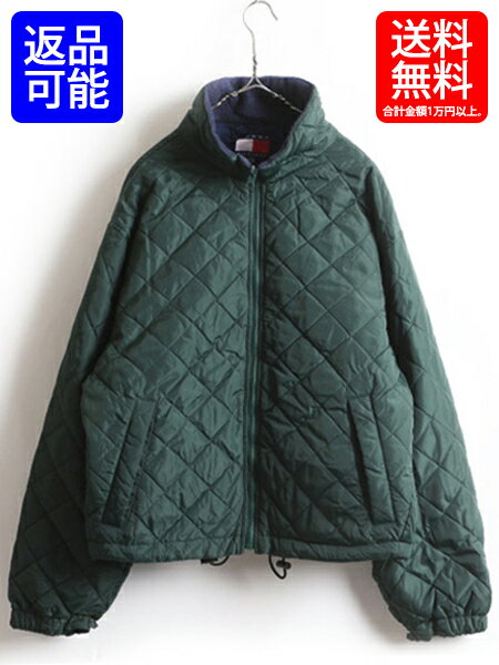 90's ■ トミー ヒルフィガーTOMMY HILFIGER 襟内フリース フルジップ 中綿 キルティング ナイロン ジャケット (男性 メンズ L ) 古着 緑| 【US古着】 ジャンパー ナイロンジャケット キルティングジャケット 中綿ジャケット 中古 90年代 無地