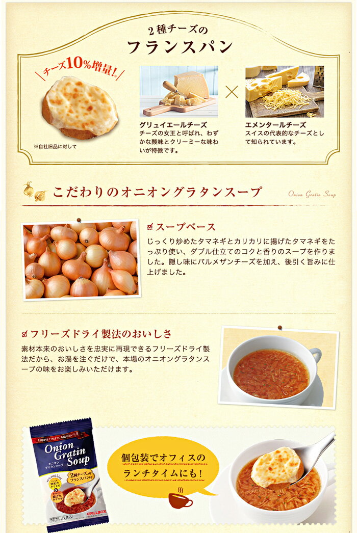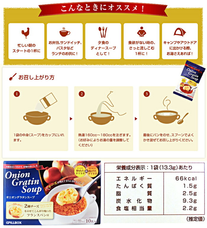 ピルボックス★オニオングラタンスープ★10食入★2種のチーズをのせてこんがり焼いたフランスパン付 PILLBOX Onion Gratin soup スープ インスタント 携行食 アウトドア キャンプ 朝食